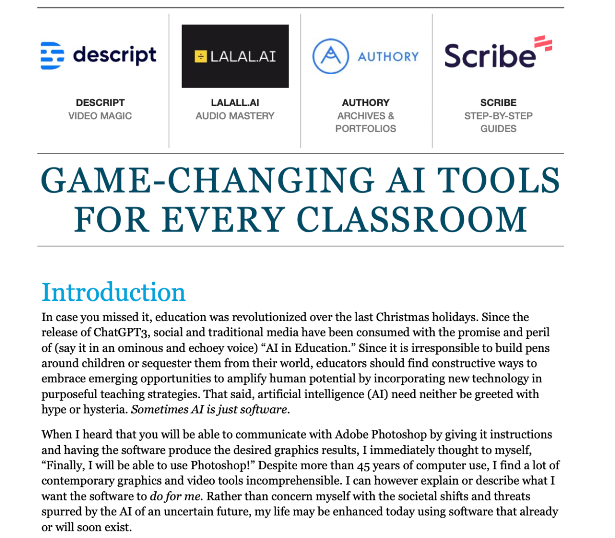 The whitepaper includes overviews of four amazing AI-enhanced software tools that you can use today. Gary Stager shares how these tools can be used by educators and students to improve the quality of all media — video, audio, and writing.